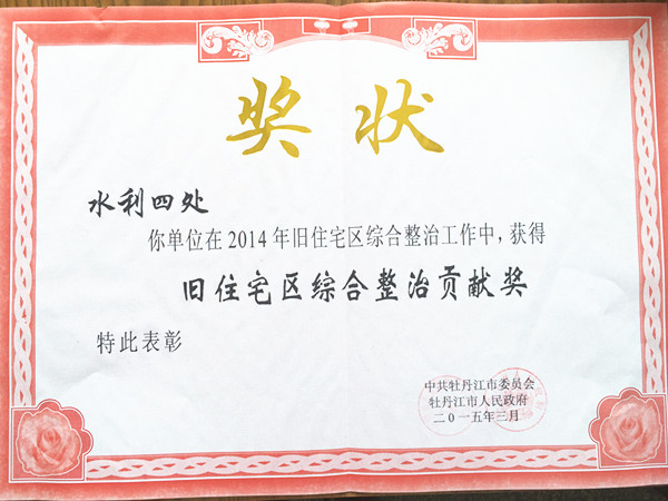 2014年,我公司出資20余萬(wàn)元,對(duì)牡丹江市西安區(qū)一棟舊住宅樓進(jìn)行了綜合改造,改變了該住宅樓臟、亂、差、舊的面貌,取而代之的是凈、整、潔、美、新的氣象,當(dāng)?shù)鼐用袷譂M意,西安區(qū)委、區(qū)政府對(duì)此也給予好評(píng)。
