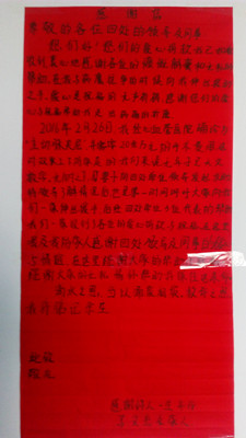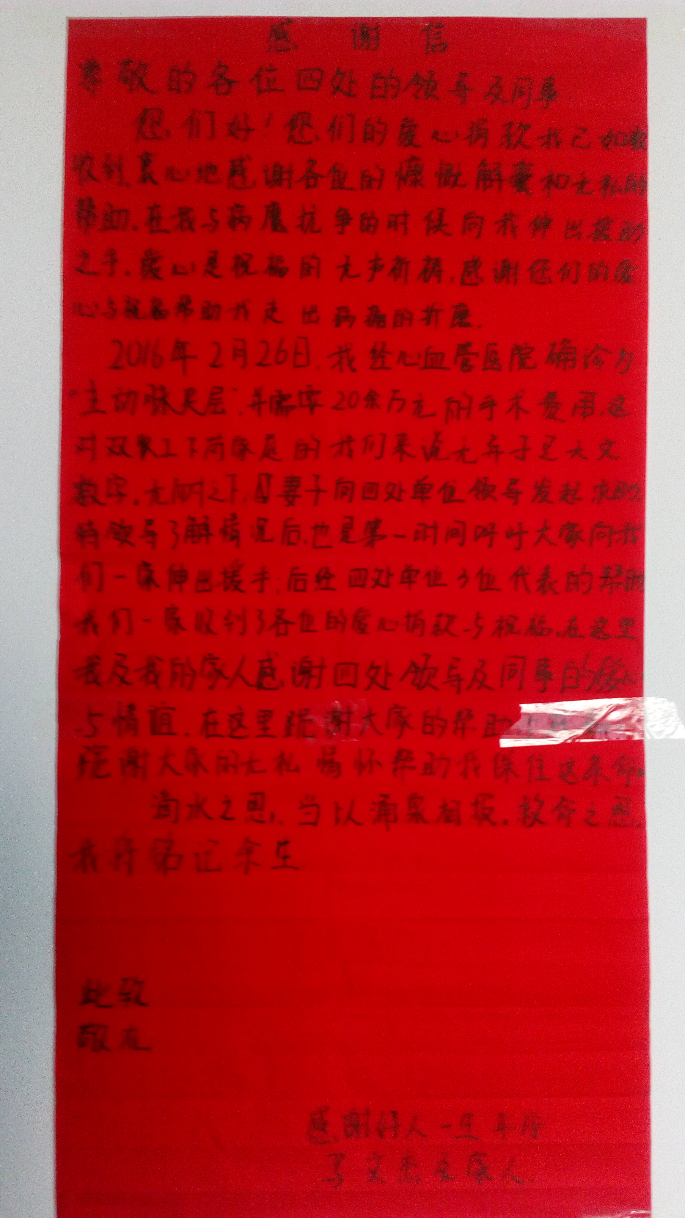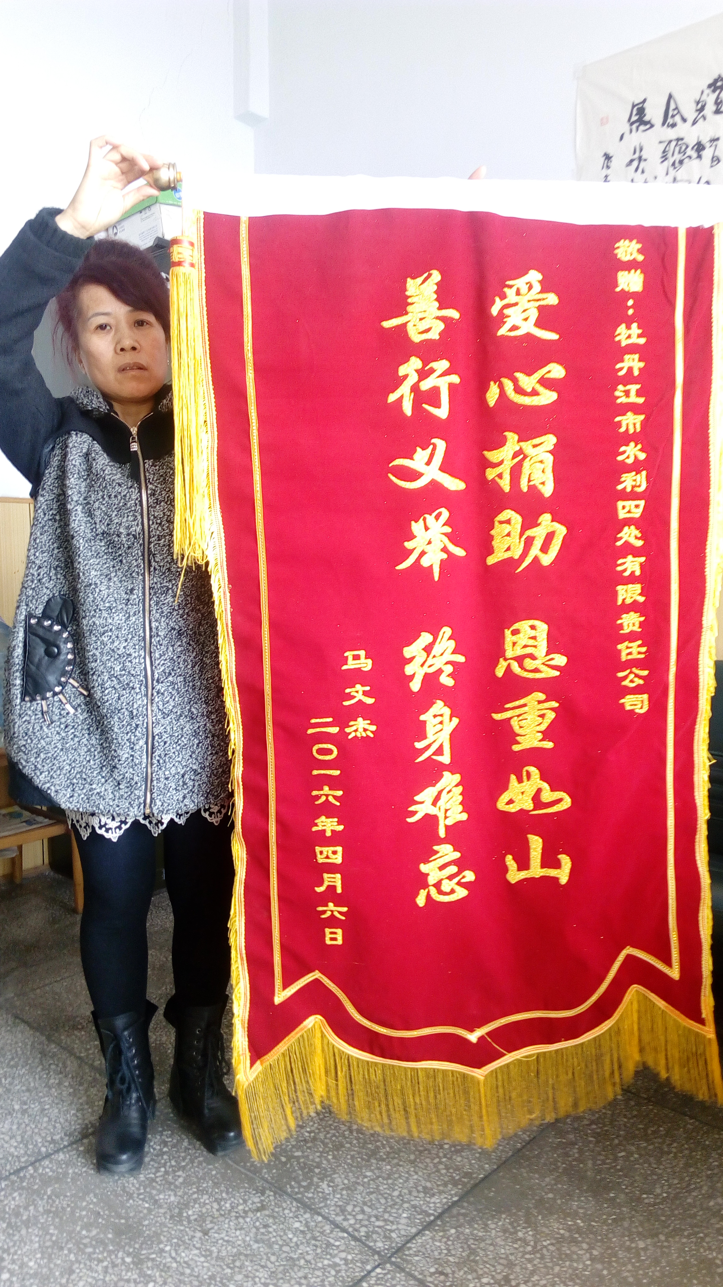 2016年四月七日,馬文杰的愛人拿著感謝信和錦旗來到我公司,再三表達全家人的感恩之情。