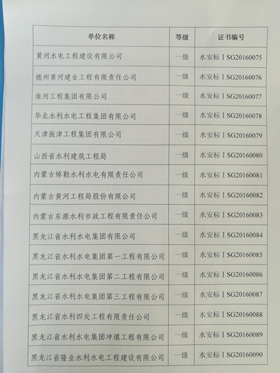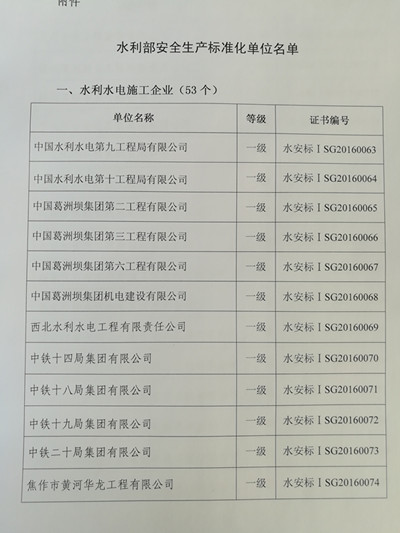 2016年12月27日,國家水利部安全監(jiān)督司行文(水安監(jiān)[2016]228號),認定包括我公司在內(nèi)的全國53家施工企業(yè)為全國水利水電安全生產(chǎn)標準化一級單位。