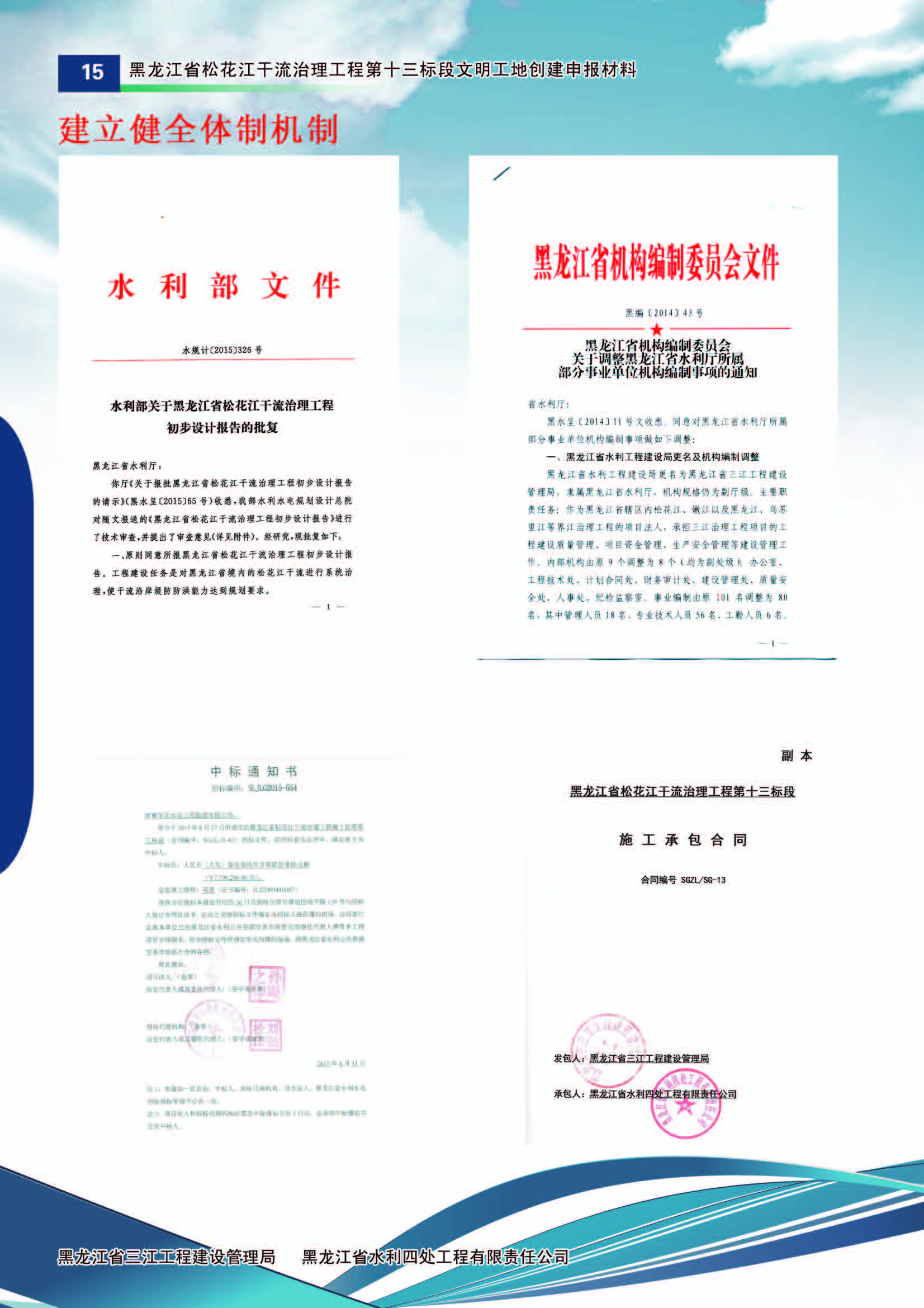 2015年8月22日,經(jīng)過公開評標,松花江干流治理工程第十三標段確定施工中標單位為黑龍江省水利四處工程有限責任公司,合同金額為1.23億元,合同工期489日歷天。