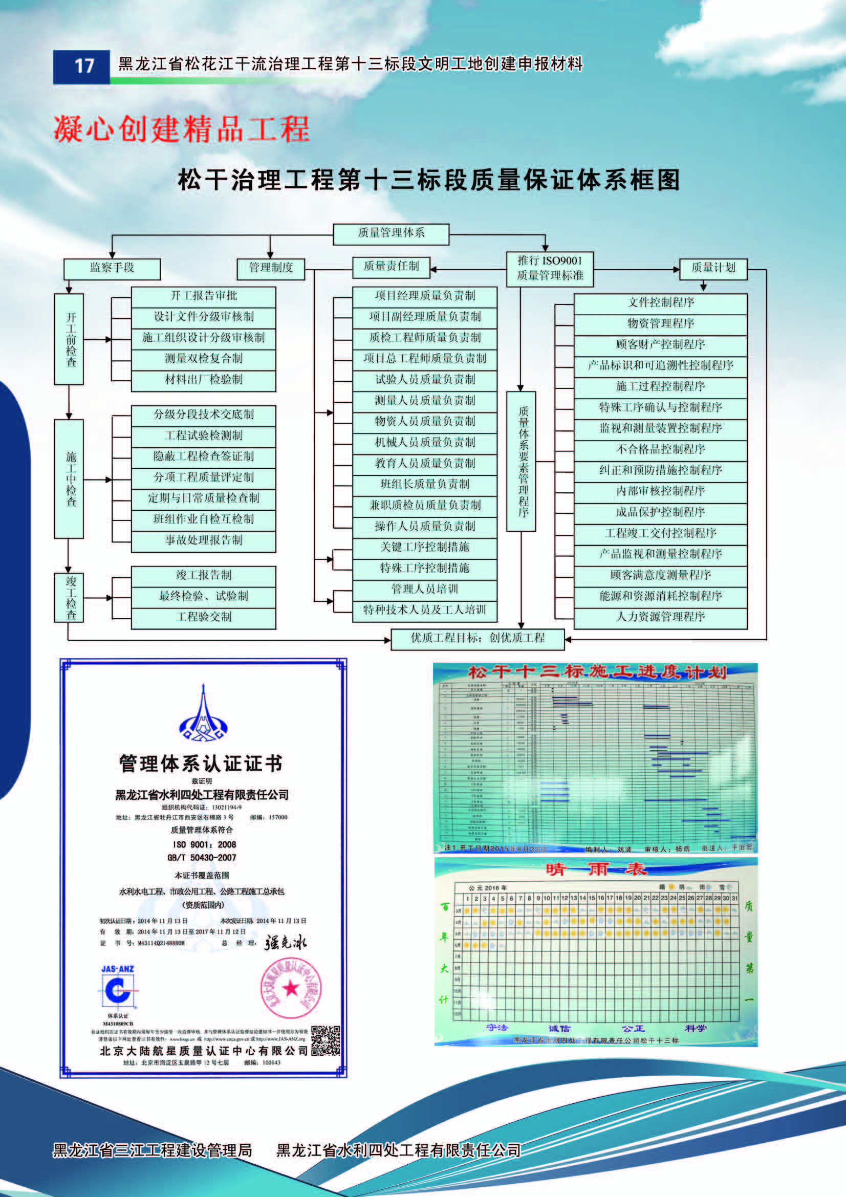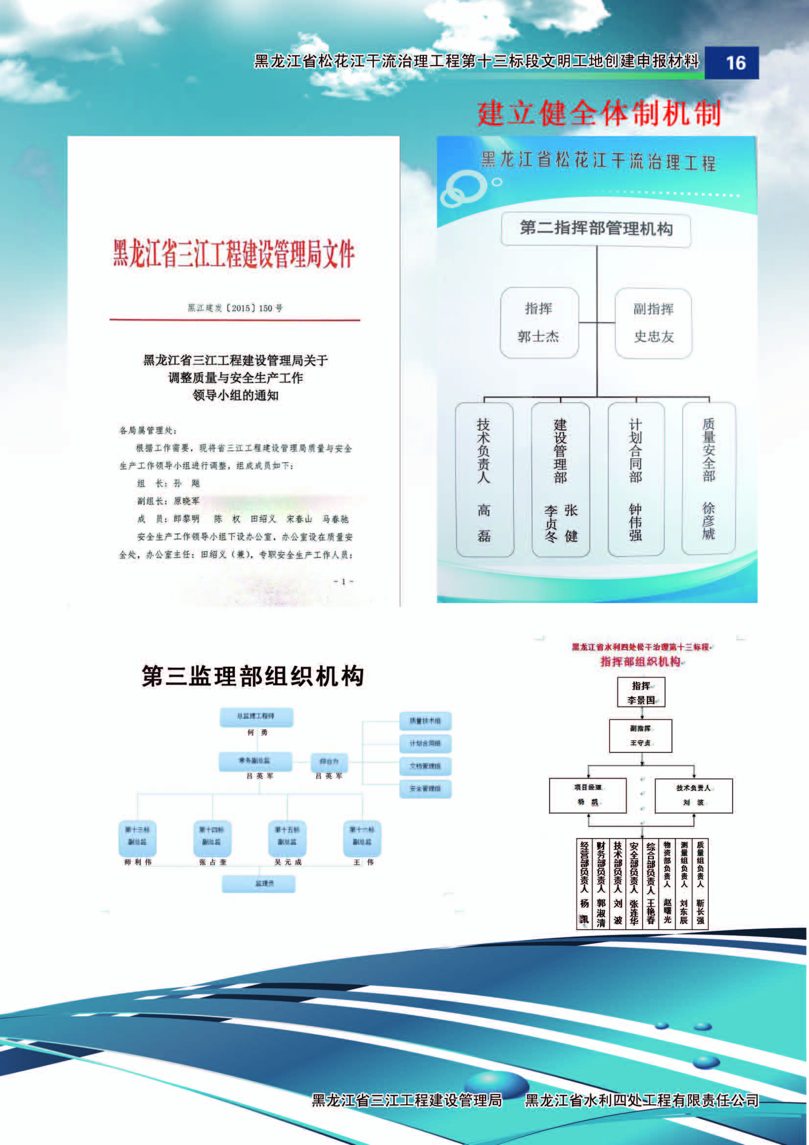 松花江處整章建制,規(guī)范運作,健全組織機構(gòu),制定并實施了工程質(zhì)量創(chuàng)優(yōu)質(zhì)、安全生產(chǎn)零事故、文明工地建設創(chuàng)優(yōu)的總體爭創(chuàng)工作目標,制定多項實施方案。松花江處根據(jù)工程跨地域建設特點,全線設置了四個工程指揮部,八個監(jiān)理部的工程指揮管理模式。施工單位成立了工程項目部,從而建立健全了松干治理工程的組織體系和保證體系,機構(gòu)職能得到有效發(fā)揮。